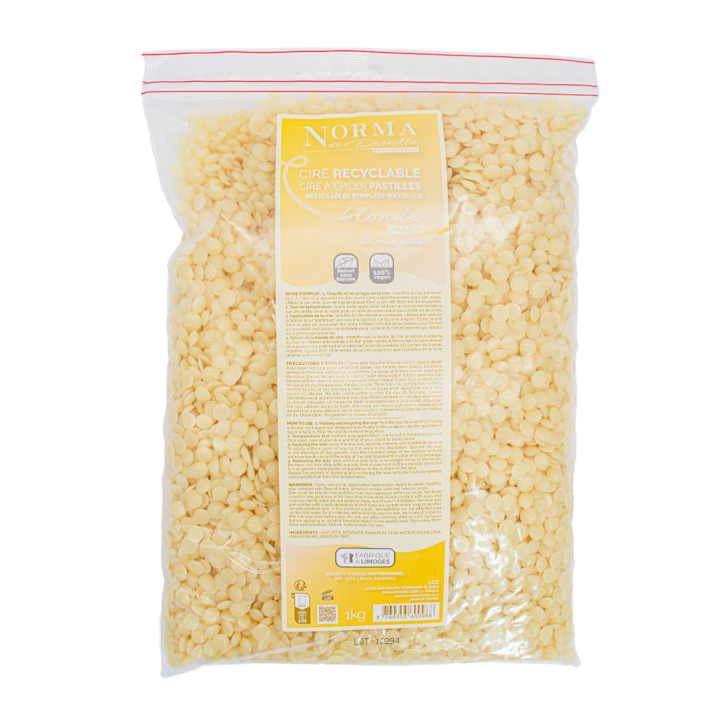 Lysor Liane présente la Cire Pastille Blonde 1 kg de Norma de Durville, une cire pelable traditionnelle qui épile efficacement, évite la casse du poil et respecte les peaux sensibles, idéale pour les zones visage et corps.
