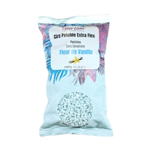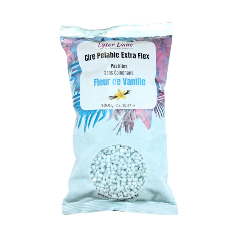 Lysor Liane présente la Cire Pelable Extra Flex Fleur de Vanille en sachet de 1 kg, une perle de cire souple au parfum gourmand qui épile efficacement tous types de poils tout en soin et confort, sans besoin de bande.