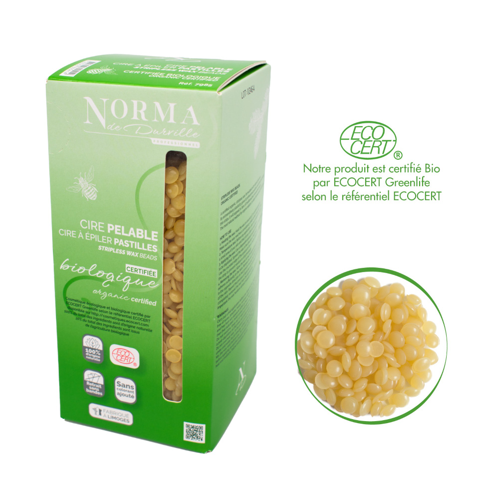 La cire pelable 100% BIO Norma de Durville s’utilise sur toutes les zones du corps. D’origine 100% naturelle dont 12% issue de l’agriculture biologique. Cette cire a obtenu le label ECOCERT. Formulée à base de résine de pin naturelle, elle respecte l’environnement.
