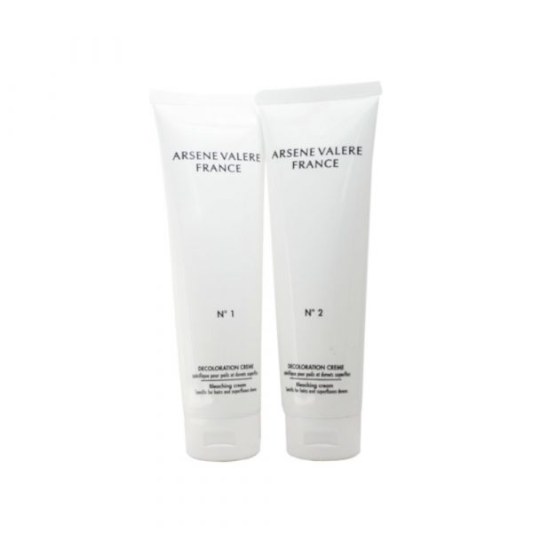 La décoloration se compose de deux tubes (Crème N° 1 + Crème N° 2) : le tube 1 contient de l’eau oxygénée, et le tube 2 contient un activateur à base d’ammoniaque.