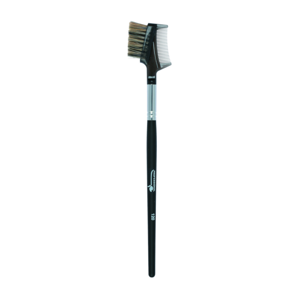 Double embout : D’un côté, une brosse en fibres synthétiques pour coiffer et mettre en forme les sourcils. De l’autre, un peigne fin en plastique pour séparer et définir les cils après l’application du mascara.
