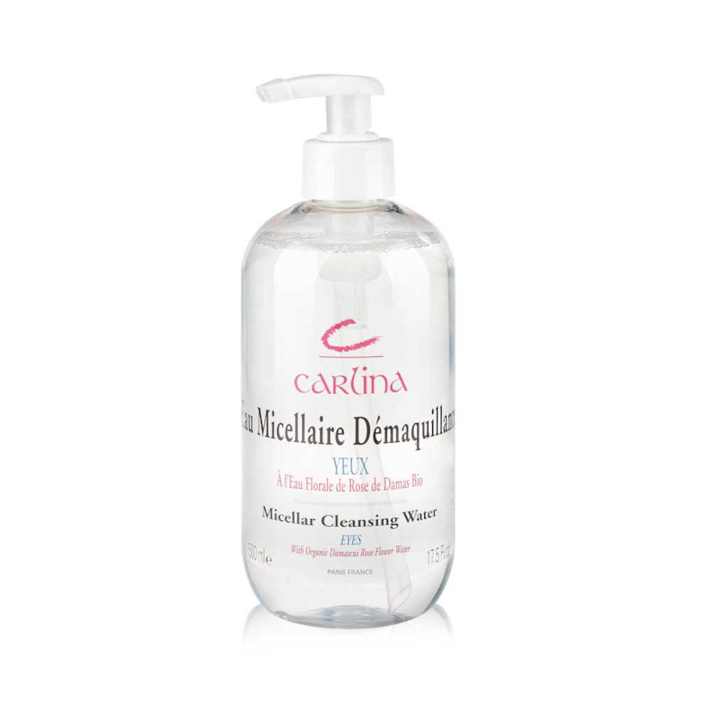 L’Eau Démaquillante Micellaire Carlina démaquille sans rinçage grâce à l’eau florale de rose de Damas Bio.